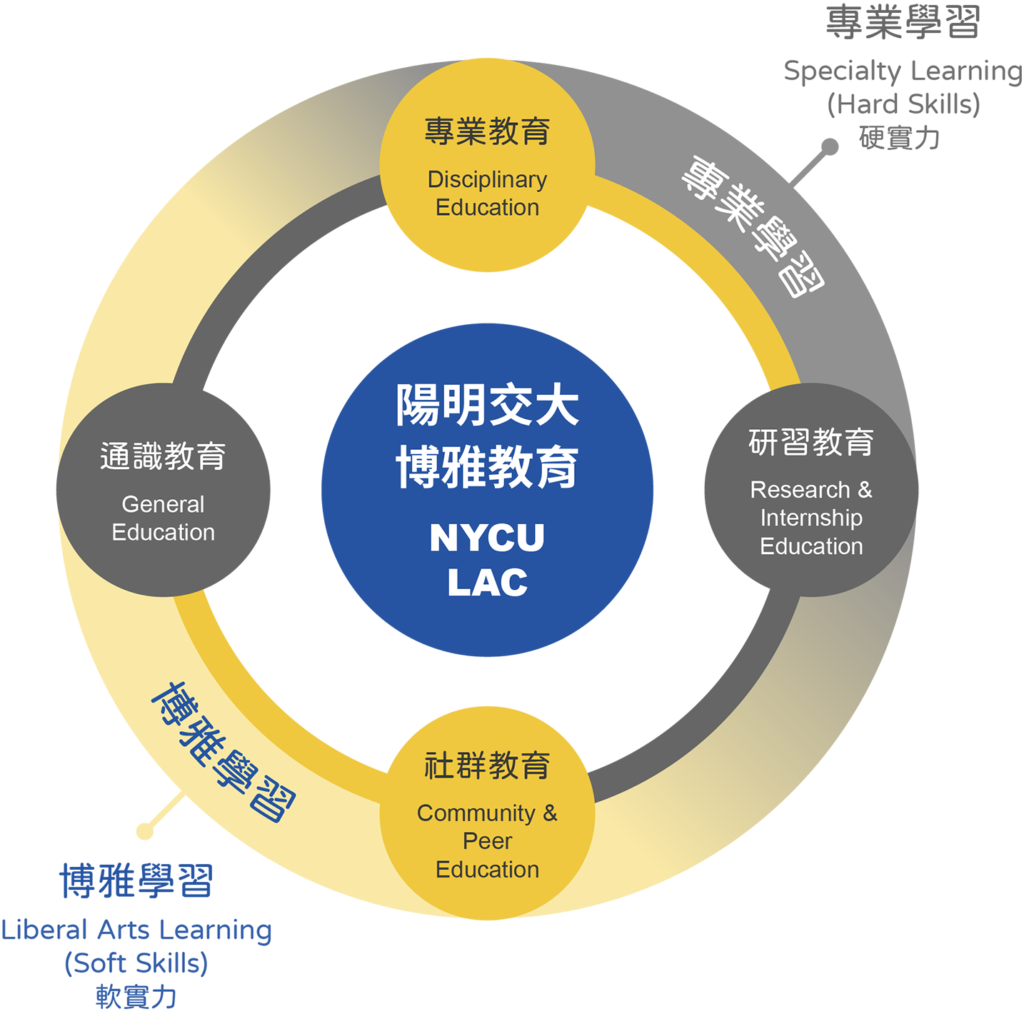 關懷人本價值的陽明交大博雅教育乃是融合 「專業教育」、「通識教育」、「研習教育」和「社群教育」的「多元跨域」教育模式;推動課堂內、課堂外以及住宿學習等全方位的博雅學習理念;培養出擁有寬廣的視野以及核心能力的π型人才,能掌握時代脈動,設計出新的社會。