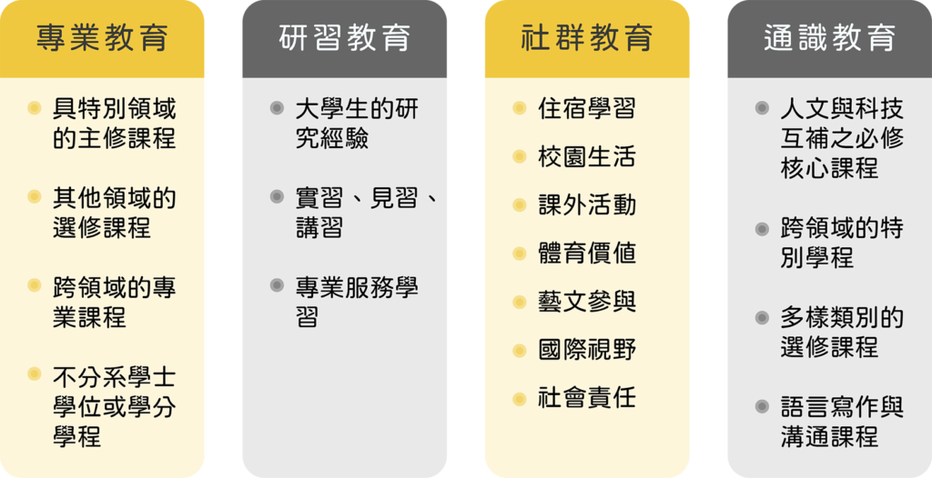 陽明交大的「多元跨域」博雅教育模式是建立在歐美實施近千年的Liberal Arts Education,其教育哲理之四大要素如下: