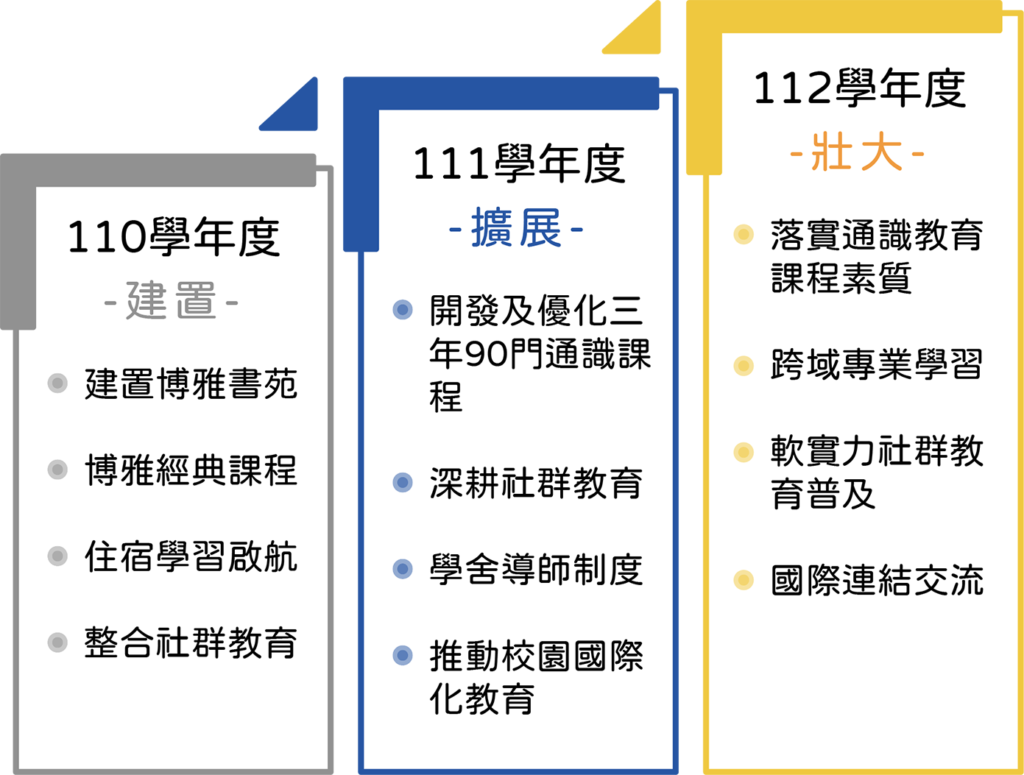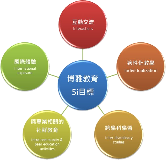 - 生活實踐:博雅教育是相對於職業或專業教育而言,其目的在「人格導向的〈安身立命〉與〈修身養性〉之學」。它不只是通識教育的知識,而更進一步的強化通才教育在生活上的實踐。